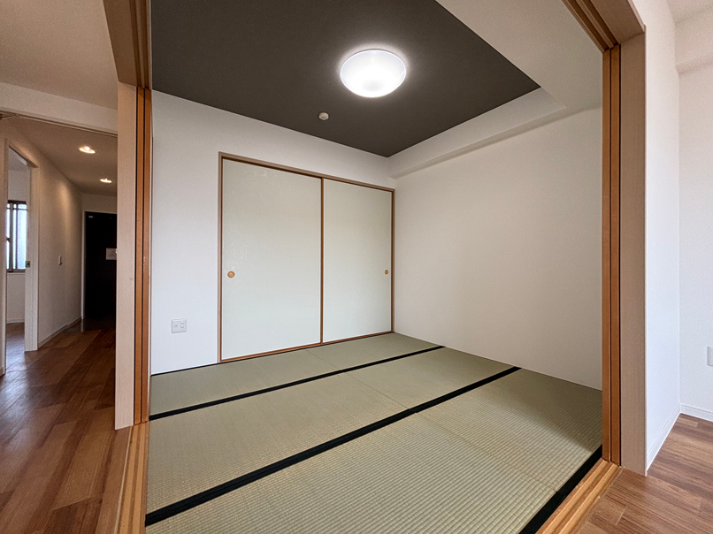 リビング続きの和室は、開放感がありつつも自然にゾーニングされていて、和モダンな雰囲気。
