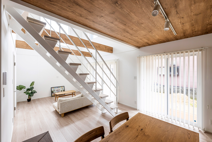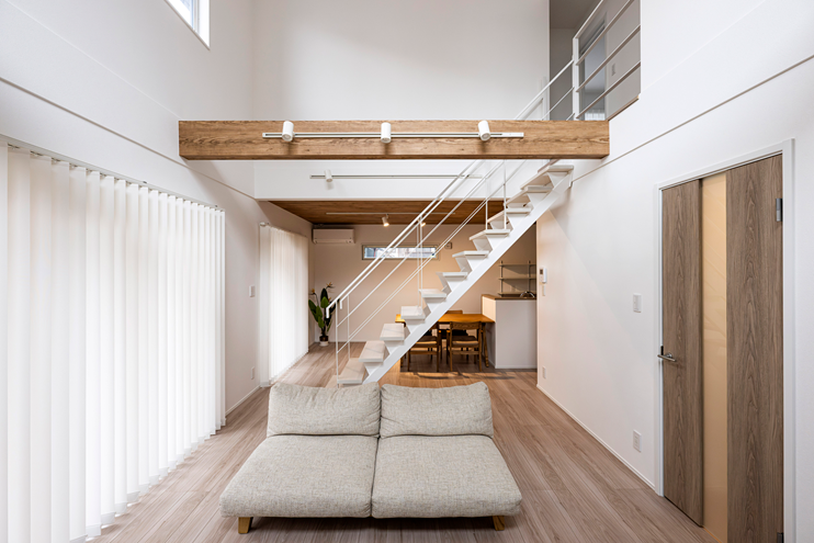 室内は明るい床材に吹き抜けのある開放的なリビング。